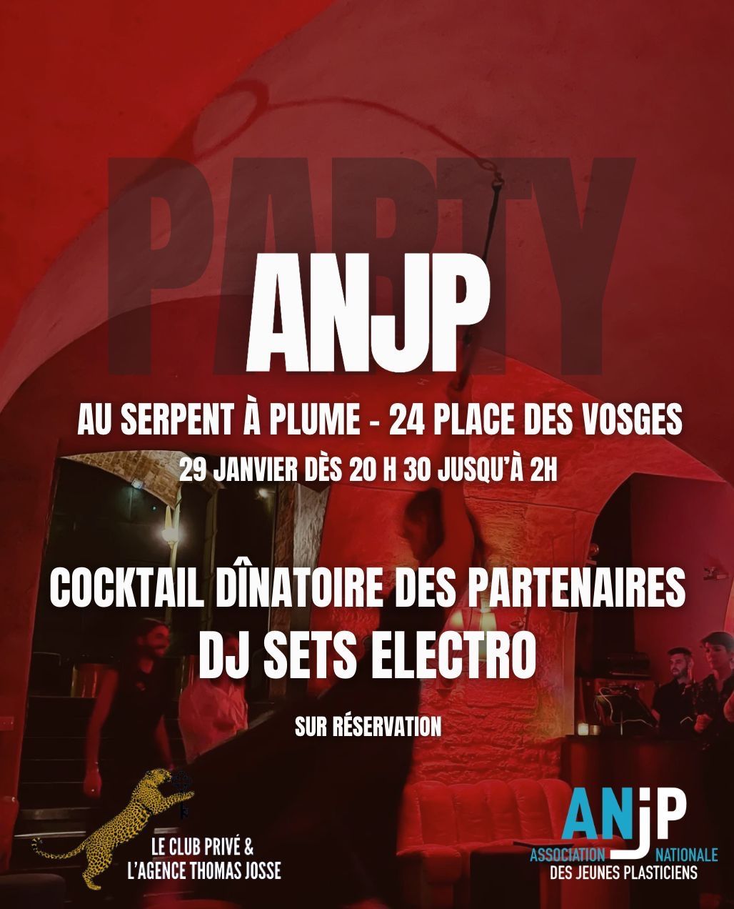 Présentation des industriels en chirurgie autour d'un cocktail dînatoire de 20 h à 22 h ( résérvé aux membres ANJP ) DJ SETS & performeur de 22 h à 2 h INSCRIPTION SOUMISE À VALIDATION